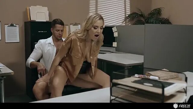 Stunning blonde Blake Blossom has her time frozen in the office, allowing her busty boss to pound her while she rides and eats pussy. Her leather skirt flies off as her big boobs jiggle, and she moans loudly as he face fucks her and cums on her tits. The CfnM scene is naughty!