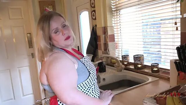 Busty British MILF wife Megan deepthroats her husband's cock in the kitchen. Watch from POV as she gobbles his meat and rides his face. She cums deep before swallowing his load.